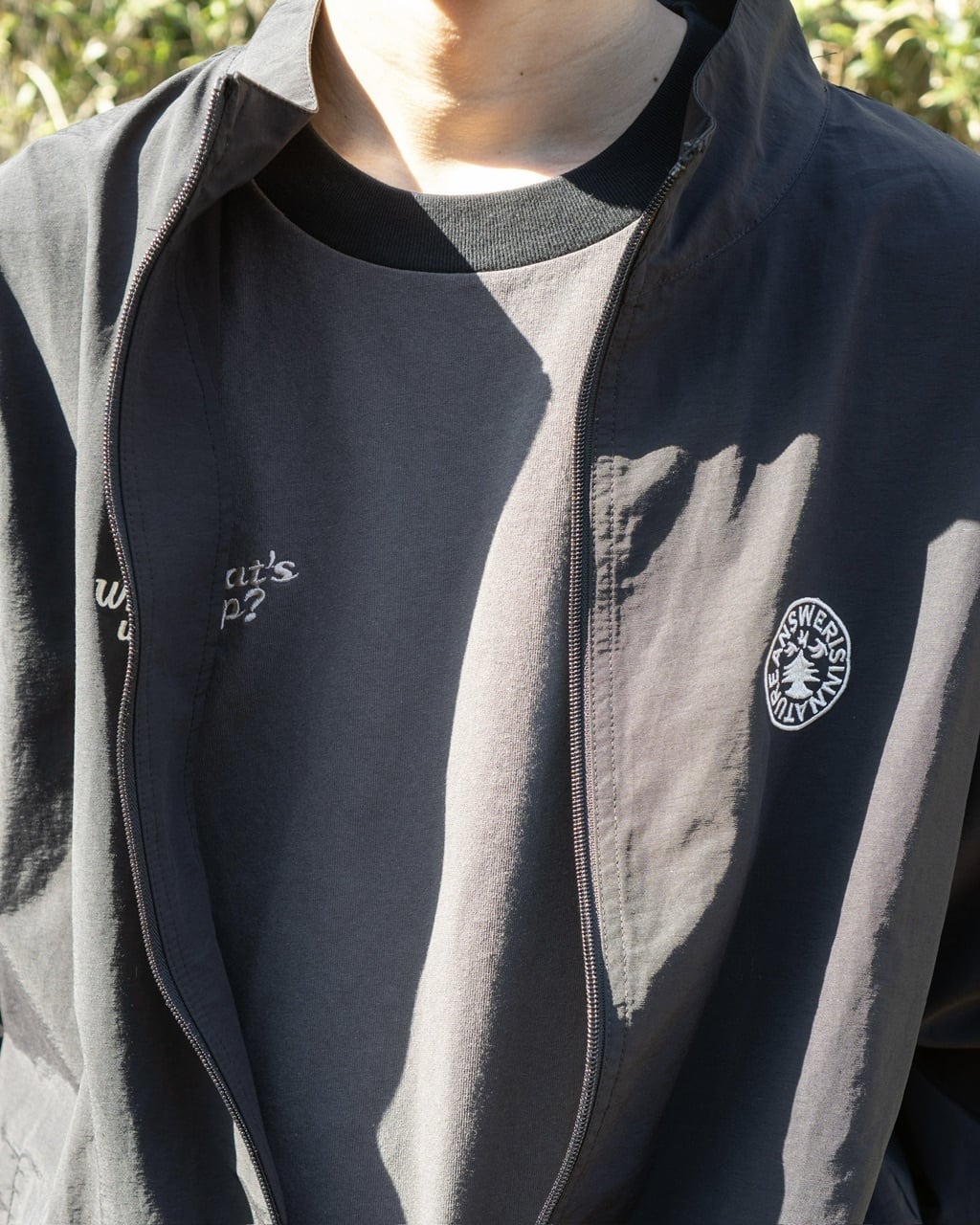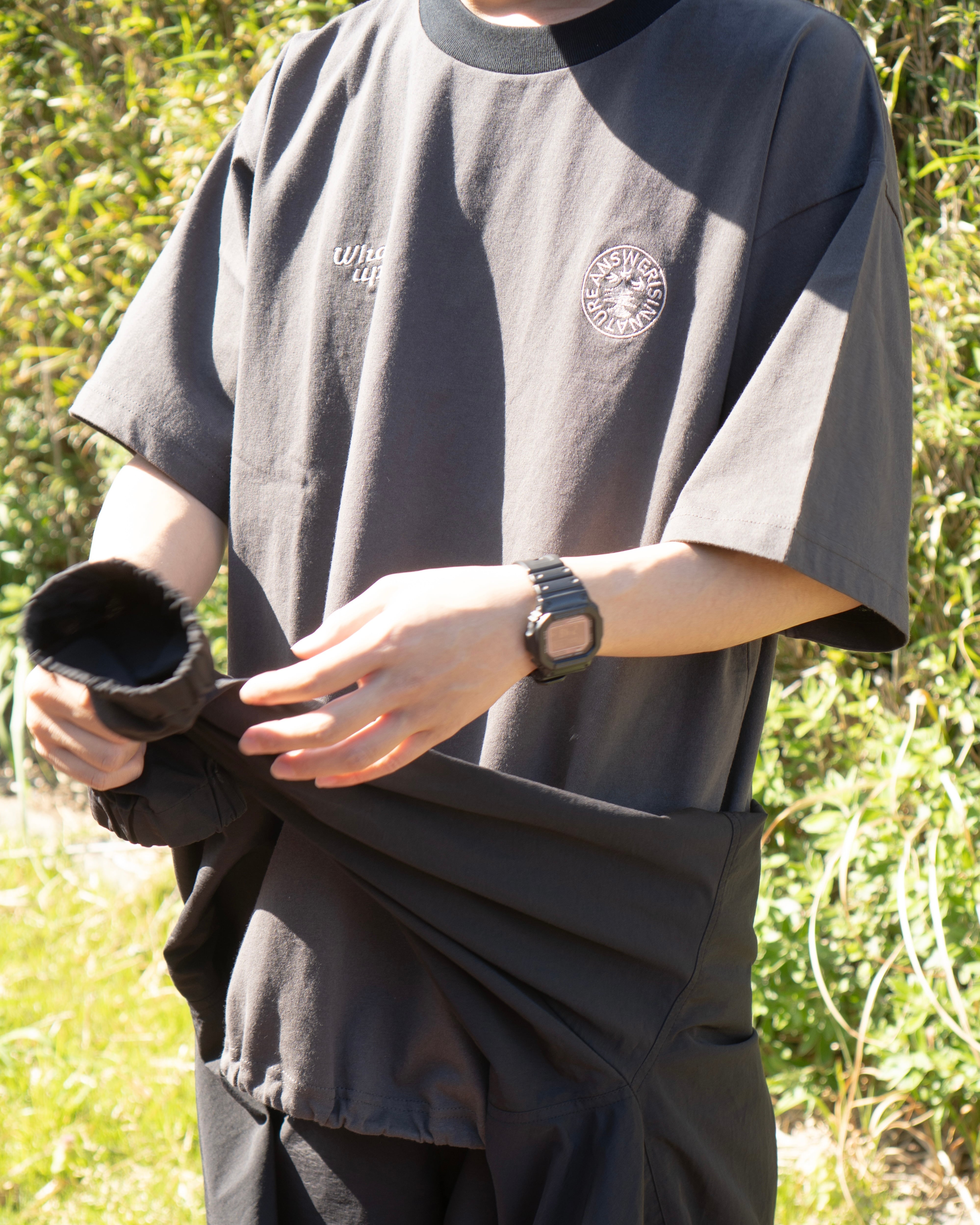 昨年人気だった刺繍Tシャツにドローコードを付け、身幅をややワイドに。